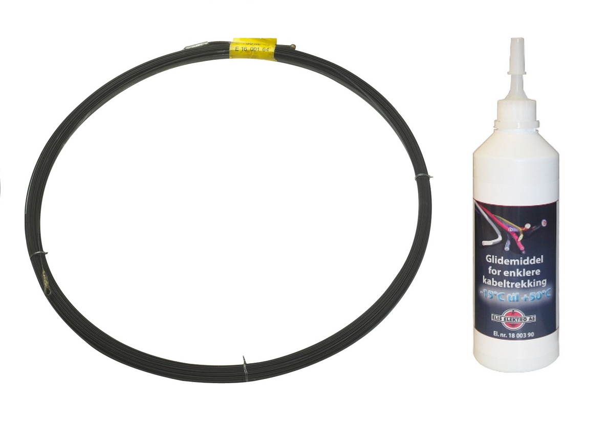 Oval kabeltrekkefjær i stål med søkerspiral, 30 meter lengde og 3mm bredde inkl. middel som forenkler trekkingen.